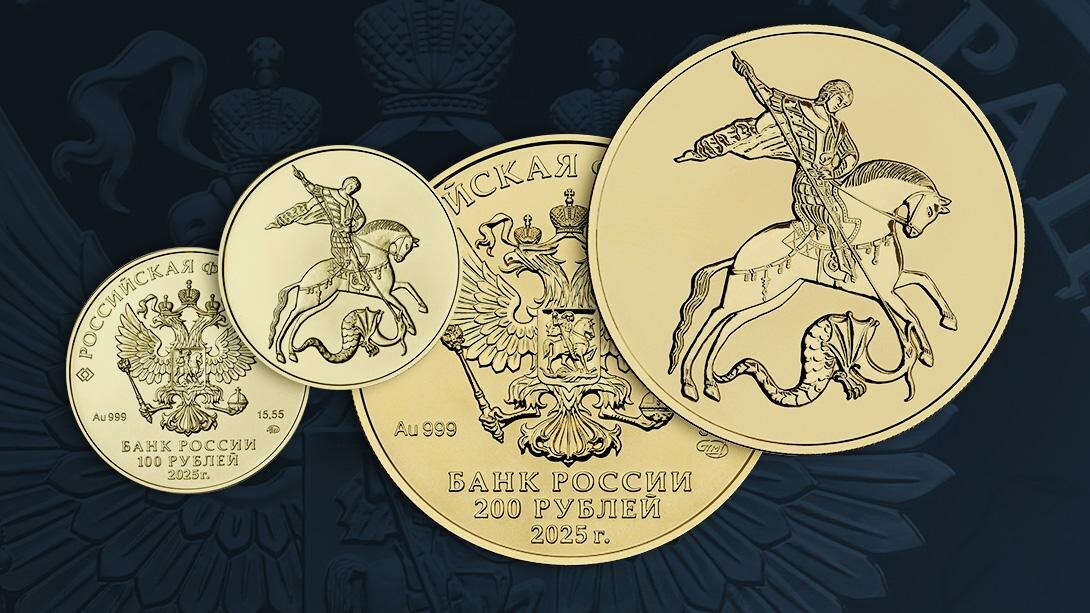 Банк России представил новые золотые монеты номиналом 100 и 200 рублей с изображением Георгия Победоносца.