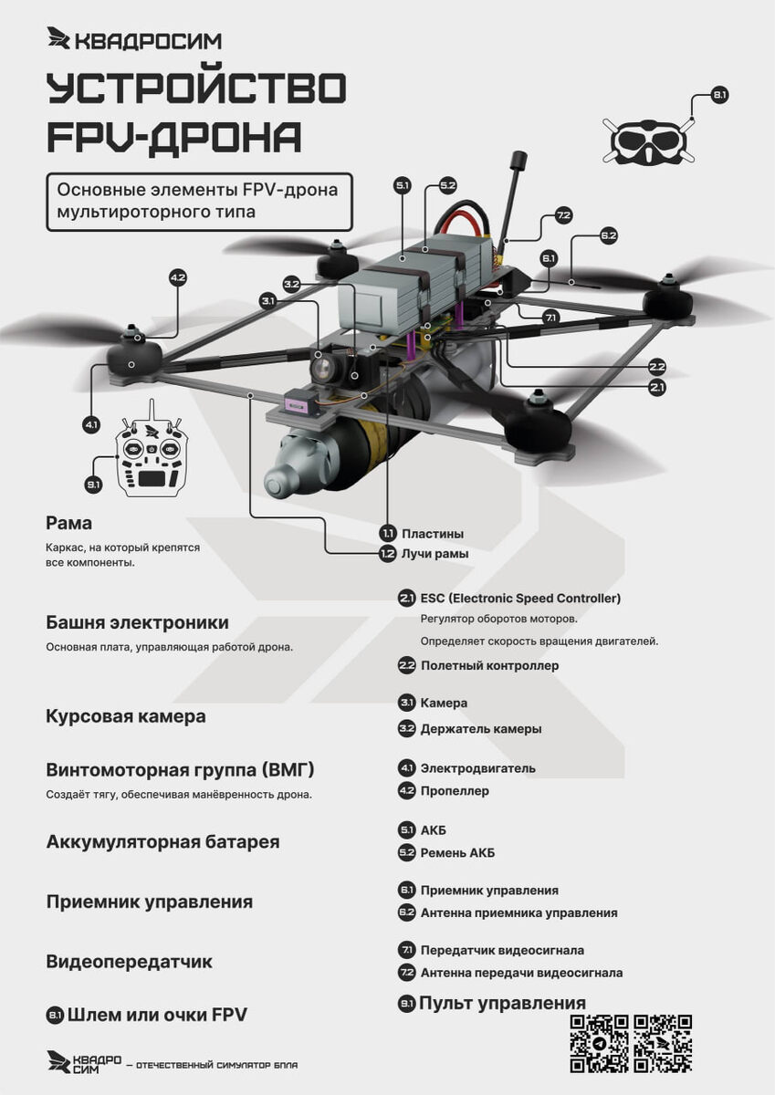 Компания «Квадросим» разместила в открытом доступе серию учебных пособий, посвящённых практическим аспектам эксплуатации беспилотных летательных аппаратов. Среди тем — устройство FPV-дронов, управление полётом, эксплуатация аккумуляторов, работа в симуляторе, зоны бронирования военной техники и минимальный комплект снаряжения для полевых условий.