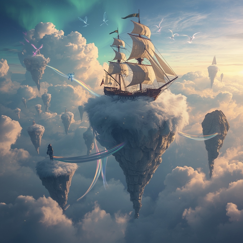 Вокруг них простирался мир, который казался сотканным из мечты. Острова парили в воздухе, соединённые радужными мостами. Кристаллические дворцы медленно вращались в танце с облаками, а существа из чистой энергии ветра порхали между строениями.