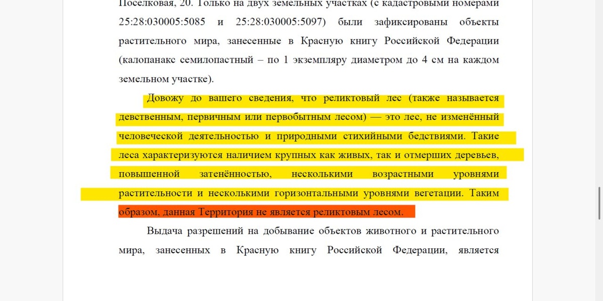 · Игнорирование фактов. В ответе упоминается, что на двух участках обнаружили краснокнижные растения. Но это, видимо, мелочь, на которую можно не обращать внимания.