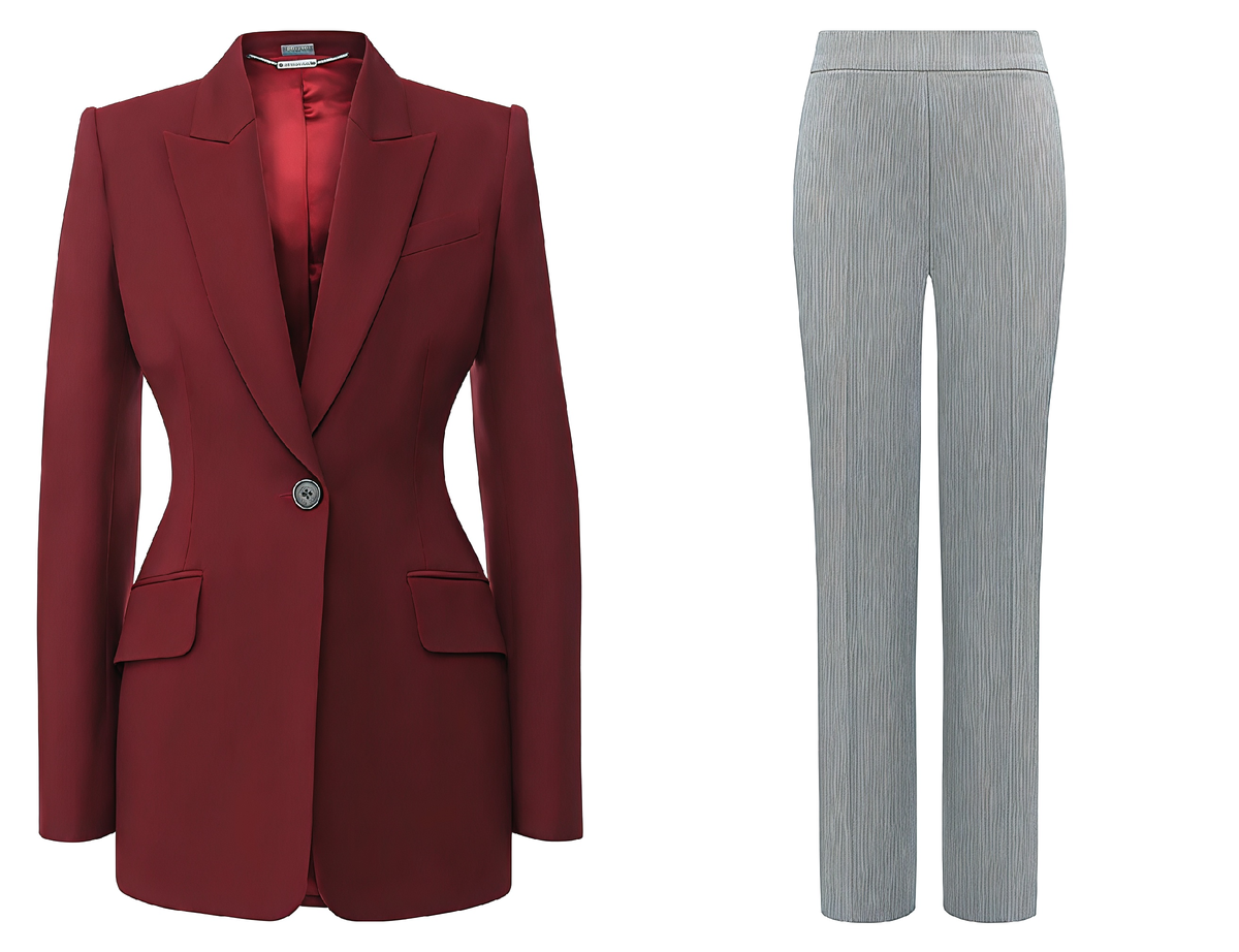 Схема 1: Офисная элегантность. Серые брюки прямого кроя + вишнёвый жакет + молочная блуза + чёрные ботильоны. Добавьте структурированную сумку бордового цвета. Образ собранный, но не скучный.