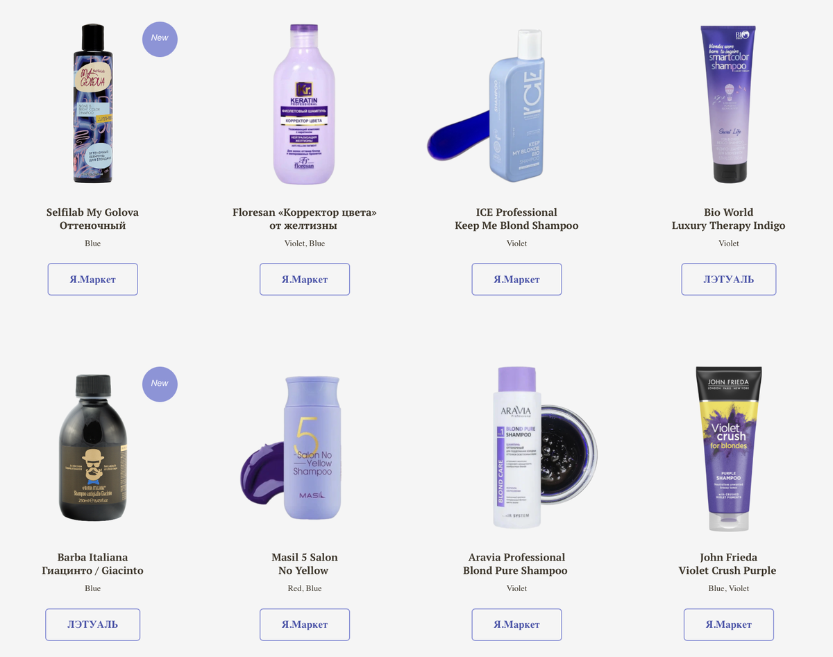 Осветленные и седые волосы, как пористая губка, впитывают буквально все из окружающей среды: пыль, смог, табачный дым, ржавчину из водопроводной воды, остатки стайлинга. Эти частицы оседают на волосах и постепенно проступает их цвет через поврежденные слои кутикулы, придавая волосам ржавый оттенок. Тонирование вымывается со временем, летом волосы еще выгорают на солнце, в итоге проявляются оставшиеся после окрашивания естественные пигменты — феомеланин и эумеланин. Касторовое, ши, кокосовое — любое масло выталкивает пигмент, и оттенок начинает желтить. Еще сильно вымывают пигмент сульфаты, поэтому мастера иногда рекомендуют выбирать бессульфатные шампуни. Но при их использовании важно не забывать о качественном очищении кожи головы. Я разделила средства для поддержания холодного оттенка и нейтрализации желтизны на две категории, отталкиваясь от степени сухости и повреждения осветленных волос. Нейтрализуют излишнюю желтизну за счет сильно промывающего свойства и частиц синего (Acid Blue