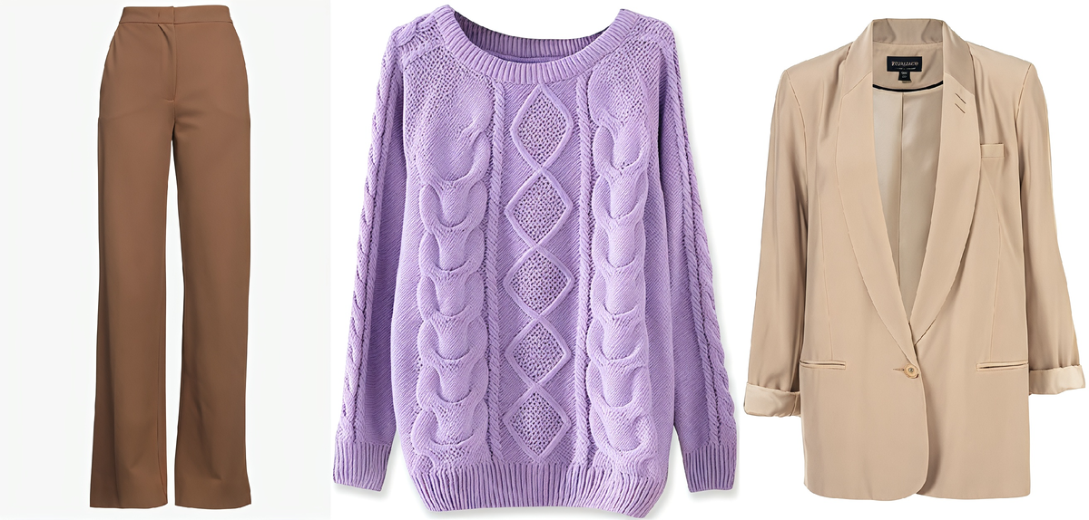 Коричневый + фиолетовый + нейтральный. Коричневые брюки, лавандовый свитер и бежевый жакет. Или баклажановая юбка, светло-коричневая водолазка и серый кардиган. Серый + винный + чёрный. Серая основа, винный акцент и чёрные детали создают глубину образа. Бежевый + зелёный + коричневый. Спокойное сочетание для прогулок и деловых встреч.