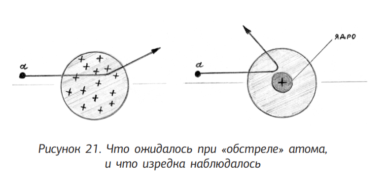 Эрнст Резерфорд, прославившийся своими исследованиями радиоактивности, решил «прощупать» атом, бомбардируя его альфа-частицами. Он обнаружил, что отдельные частицы отклонялись на очень большие углы — до 180˚ (доля таких частиц была около 1/8000) (см. рис.).
