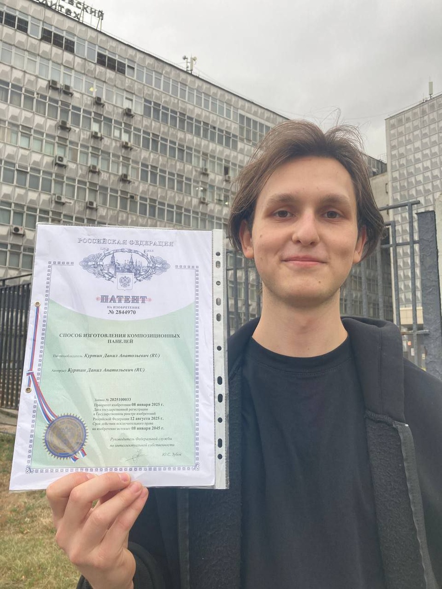 Студент Московского Политеха запатентовал безопасную технологию производства композитных панелей. Данил Куртин с 4-го курса получил патент РФ №2844970 на метод непрерывного изготовления строительных композитов. В чем суть: вместо ручного формования отдельных панелей — производство сплошной ленты, от которой отрезают куски нужного размера. Процесс полностью автоматизирован. Почему это важно: рабочие больше не контактируют с эпоксидной смолой и стекловолокном — материалами, которые вызывают повреждения кожи и дыхательных путей Производительность выше — непрерывный процесс вместо штучной формовки Решается кадровая проблема отрасли — условия труда становятся безопаснее