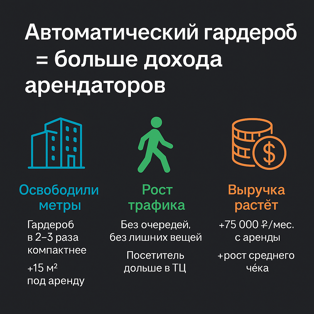 Многие думают, что автоматический гардероб — это просто удобство для посетителей. На самом деле это ещё и инструмент для роста выручки арендаторов торгового центра. Разберёмся, как работает этот эффект. Обычный гардероб занимает 15–25 м². Это место, которое не приносит денег: Автоматический гардероб: 💸 Пример: 15 м² по 5 000 ₽/м² = +75 000 ₽/мес. или почти 900 000 ₽ в год дополнительного дохода. Когда посетителю удобно, он приходит чаще и дольше задерживается: Чем комфортнее процесс хранения — тем дольше посетитель гуляет по ТЦ, заходит в большее количество магазинов, тратит больше денег. Посетитель без куртки чувствует себя свободнее, руки свободны для пакетов и гаджетов. Это повышает вероятность импульсных покупок.