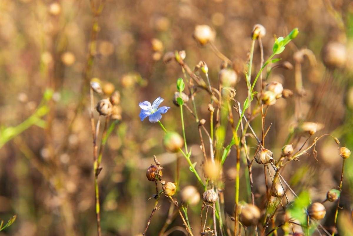 На полях фермера Александра Степанова в бабье лето зацвёл лен, который градом побило в конце июля