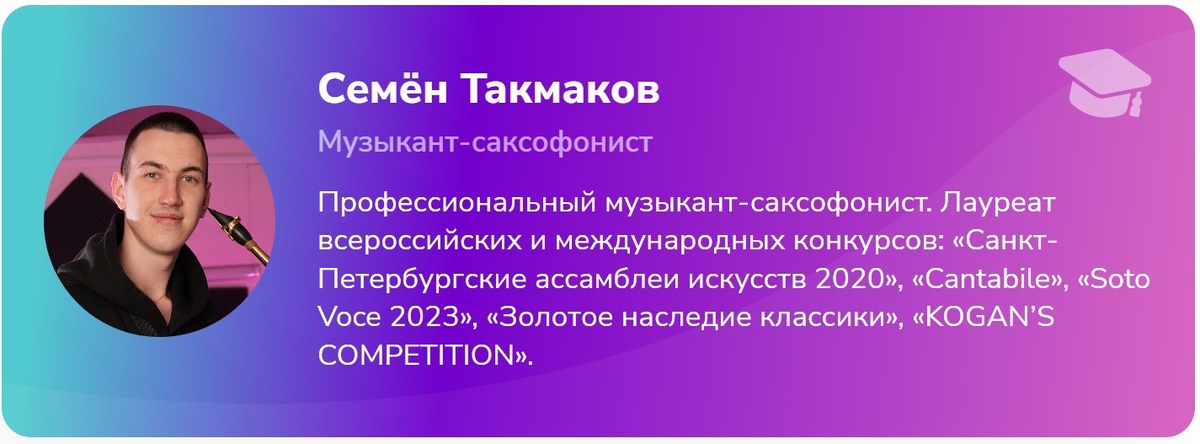 Программа от профессионала: автор курса — Семён Такмаков, музыкант-саксофонист, лауреат международных конкурсов.