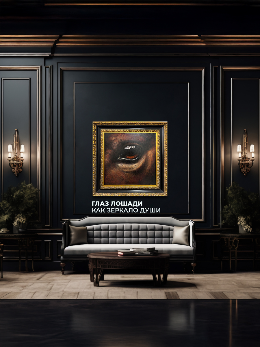 Холст 70 × 70 см в резном золотом багете Перед зрителем глаз лошади, увеличенный до масштаба вселенной. Это фрагмент, который раскрывается как портал в глубину бытия. Лошадь сопровождает человека веками: в трудах, в войнах, в путешествиях. Она символизирует силу, преданность и движение. Здесь её взгляд превращается в зеркало души. В зрачке сияет отражение деревянной церкви. Сакральное пространство проявляется через живое существо, напоминая о том, что духовное присутствует рядом, проступает в каждом взгляде, в каждой встрече. Работа соединяет две оси человеческой жизни: В этом соприкосновении рождается драма и гармония. Человек распознаёт в глазах того, кто рядом, сияние высшего. Животное, церковь и зритель оказываются связанными в едином взгляде. Золотой багет напоминает о традиции иконописи, о вечной попытке «обрамить» священное. Здесь возникает не образ Бога напрямую, а отражение, которое ведёт к мысли: каждый из нас хранит в себе храм. Эта картина раскрывает единство земного и небе