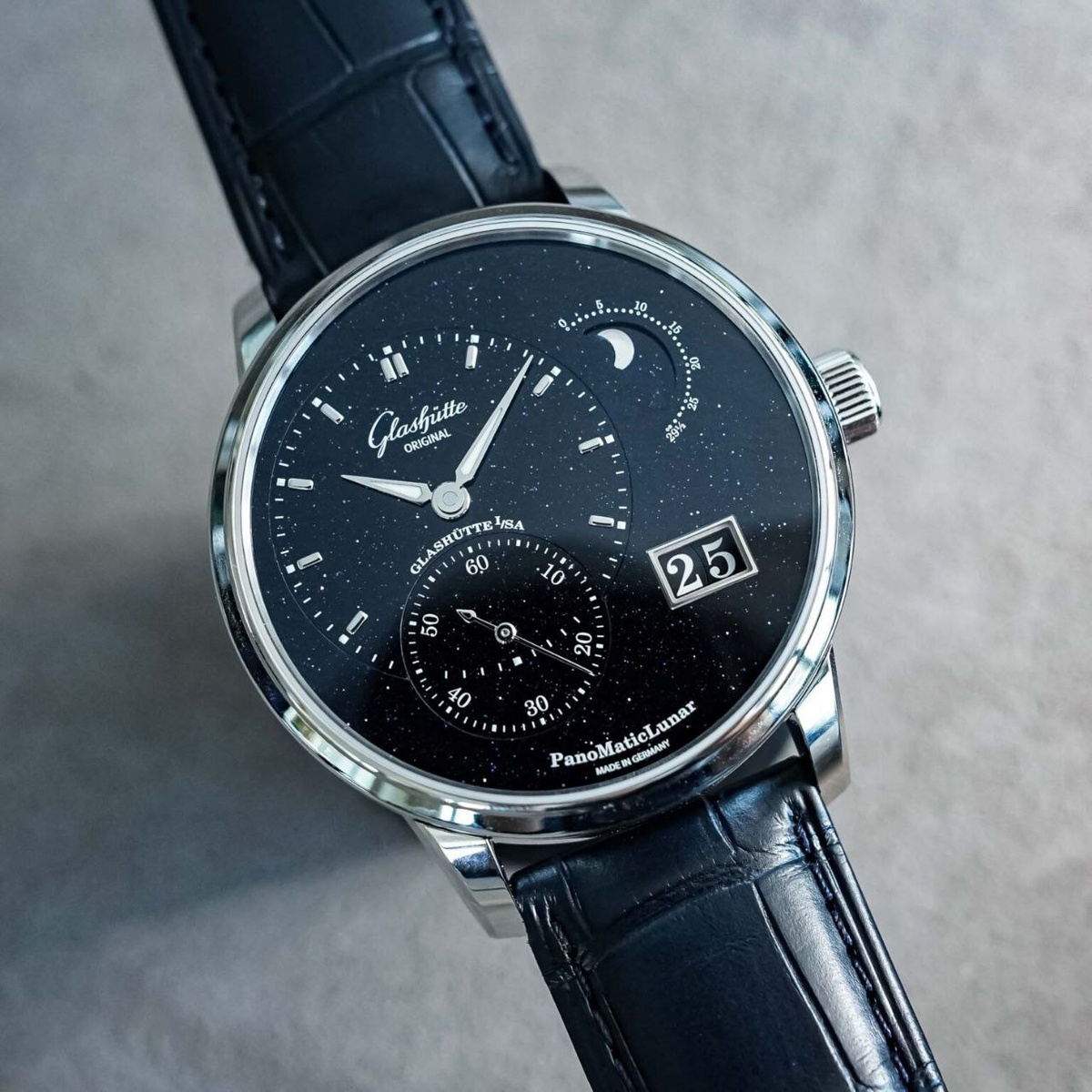Glashütte Original PanoMaticLunar: Юбилейное сияние В честь 180-летия саксонского часового искусства Glashütte Original представляет PanoMaticLunar Anniversary Edition. Лимитированная серия из 180 экземпляров сочетает платиновый корпус, авантюриновый циферблат и новый калибр, подчеркивая элегантность и техническое совершенство коллекции. Корпус и дизайн Корпус из платины диаметром 40 мм и толщиной 12,8 мм — впервые для PanoMaticLunar. Его размеры (47 мм от ушка к ушку) и водозащита 50 м сохраняют классические пропорции. Сапфировое стекло с антибликовым покрытием защищает циферблат и открывает вид на механизм. Авантюриновый циферблат тёмно-синего оттенка с медными вкраплениями напоминает звёздное небо. Смещённые индикаторы часов, минут и секунд слева, панорамная дата справа и лунная фаза на 2 часах с перламутровой луной создают поэтичный образ. Белое золото с Super-LumiNova для стрелок и меток обеспечивает читаемость. Новый механизм Калибр 92-14 — эволюция серии. Автоматический, с ча