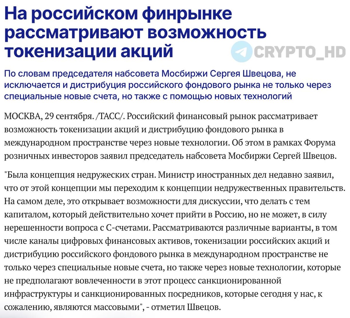 π·πΊ Π Π ΠΎΡΡΠΈΠΈ ΠΏΠ»Π°Π½ΠΈΡΡΡΡ ΡΠΎΠΊΠ΅Π½ΠΈΠ·ΠΈΡΠΎΠ²Π°ΡΡ Π°ΠΊΡΠΈΠΈ. ΠΡΠ΅Π΄ΡΠ΅Π΄Π°ΡΠ΅Π»Ρ Π½Π°Π±ΡΠΎΠ²Π΅ΡΠ° ΠΠΎΡΠ±ΠΈΡΠΆΠΈ Π‘Π΅ΡΠ³Π΅ΠΉ Π¨Π²Π΅ΡΠΎΠ² ΡΠΎΠΎΠ±ΡΠΈΠ», ΡΡΠΎ ΠΎΠ±ΡΡΠΆΠ΄Π°Π΅ΡΡΡ Π²ΡΠΏΡΡΠΊ ΡΠΎΡΡΠΈΠΉΡΠΊΠΈΡ