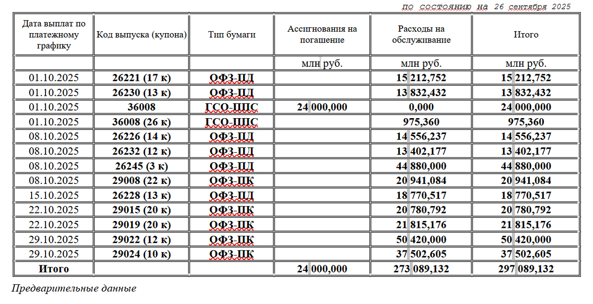 Минфин опубликовал данные о выплатах по ОФЗ в октябре: