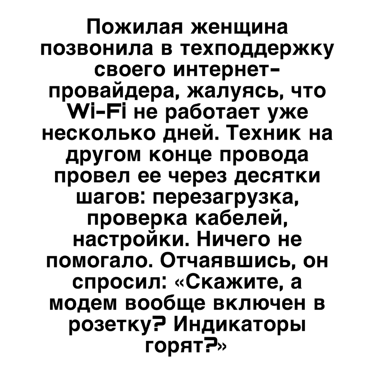 Пожилая женщина позвонила в техподдержку своего интернет-провайдера, жалуясь, что Wi-Fi не работает уже несколько дней. Техник на другом конце провода провел ее через десятки шагов: перезагрузка, проверка кабелей, настройки. Ничего не помогало. Отчаявшись, он спросил: «Скажите, а модем вообще включен в розетку? Индикаторы горят?»