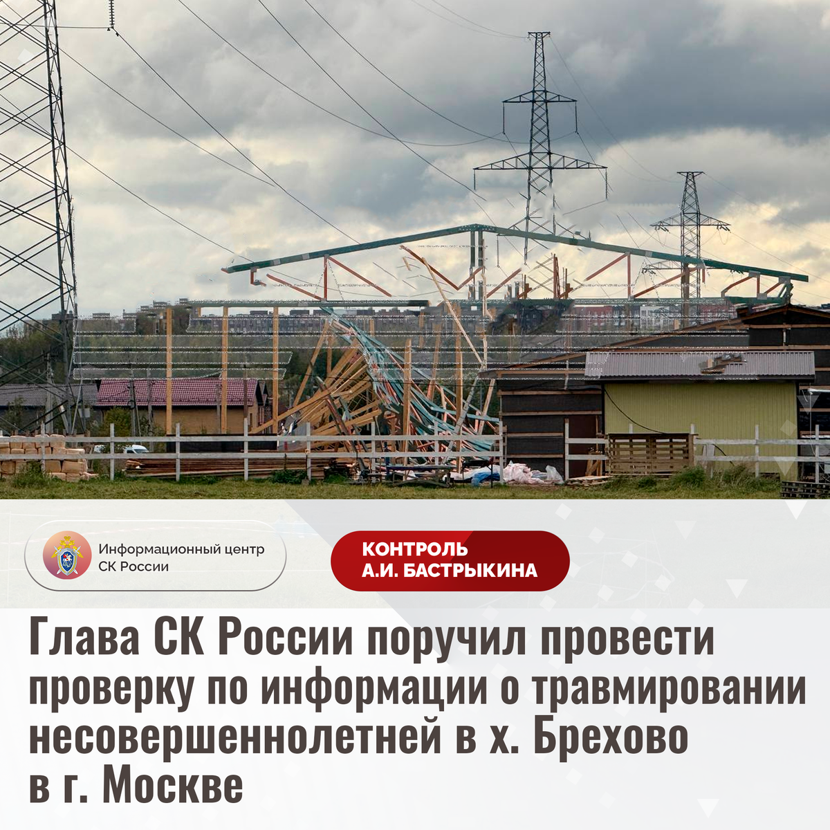 Глава СК России поручил провести проверку по информации о травмировании несовершеннолетней в х. Брехово в г. Москве В телеграм-канале сообщается, что 28 сентября текущего года в хуторе Брехово в городе Москве произошло частичное обрушение кровли введенного в текущем году в эксплуатацию каркасного конного манежа, в результате чего пострадала 17-летняя девочка, которой потребовалась медицинская помощь. Председатель Следственного комитета Российской Федерации Александр Иванович Бастрыкин поручил руководителю ГСУ СК России по городу Москве Дмитрию Владимировичу Беляеву провести процессуальную проверку и доложить о ее предварительных и окончательных результатах. Исполнение поручения, а также ход процессуальной проверки поставлены на контроль в центральном аппарате ведомства. #СледственныйКомитет #СКРоссии #СКР #ИЦСКР #Информационныйцентр #АлександрБастрыкин #ПредседательСКР #КонтрольПредседателяСКР #КомментарийКонтроль #Москва