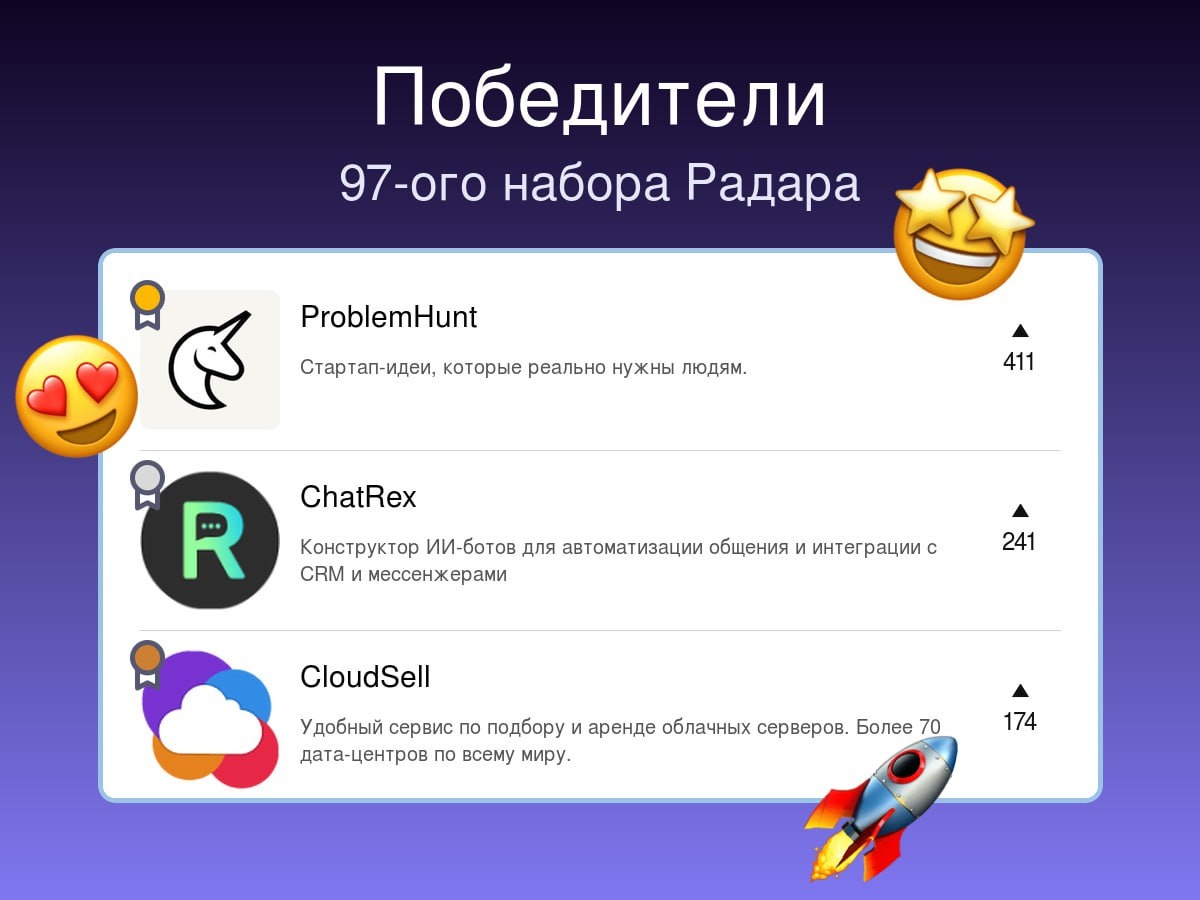 Победители прошлой недели на Радаре 97-й набор 🥇ProblemHunt 🤝 Стартап-идеи, которые реально нужны людям. 🥈ChatRex 💰💼🤝 Конструктор ИИ-ботов для автоматизации общения и интеграции с CRM и мессенжерами 🥉CloudSell 🎓👨💻💰🔥🤝 Удобный сервис по подбору и аренде облачных серверов. Более 70 дата-центров по всему миру. Новый раунд стартапьих бегов и новые проекты уже на вашем Радаре!🌚 — ⭐️ Вы можете Поддержать Радар и получить значок «Друг Радара», а также доступ в закрытый канал и к базе знаний для развития стартапа с нуля — 📤СТАВЬТЕ РЕАКЦИИ: «🎉» – Урааааа! «🔥» – Все молодцы! «🏆» - Я голосовал(-а) за победителя 🦄