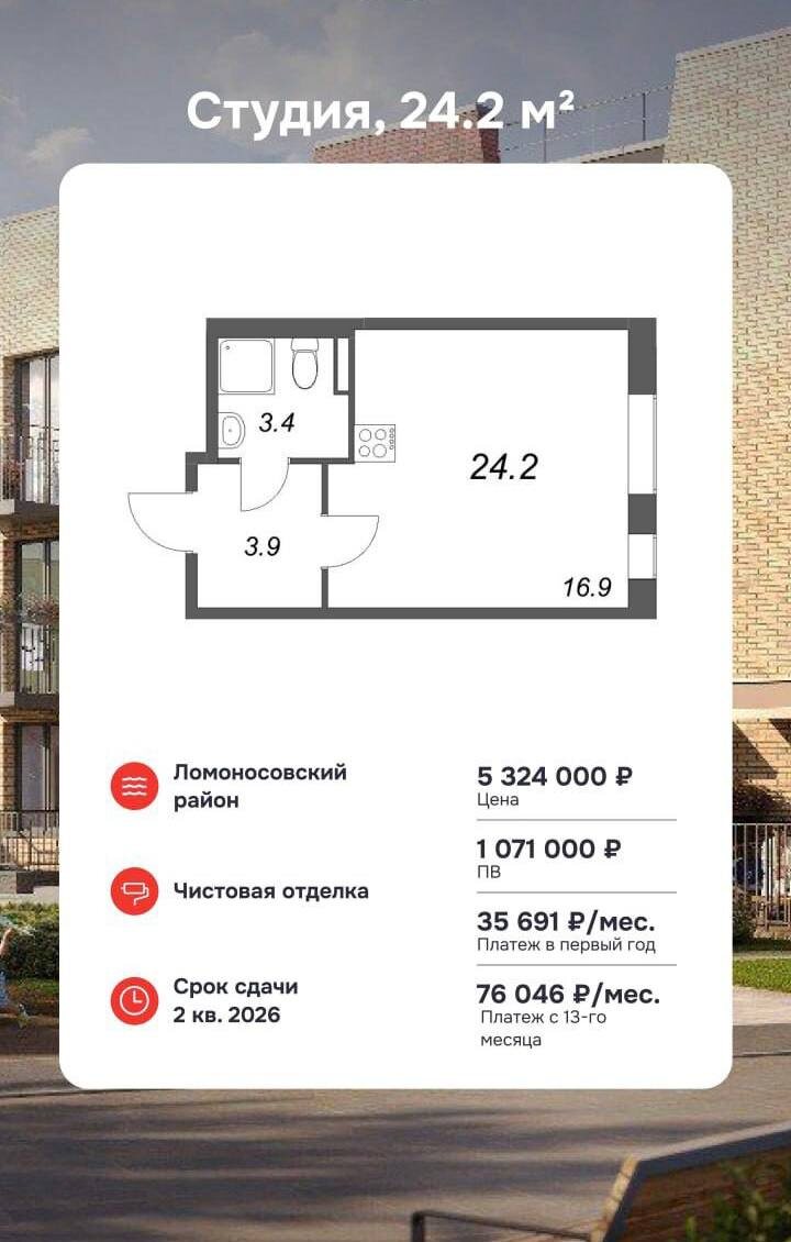 Акция от Альфа-Банка «Год без забот» — платите меньше уже сейчас Если вы планируете продажу своего текущего жилья или держите деньги на вкладах, а купить новое жильё пока не решаетесь, тогда эта программа для вас: 👍 «Год без забот» совместно с Альфа-Банком. В чём суть? • Первый год (12 месяцев) — субсидированная ставка 9% по ипотеке • Платежи в этот период в 2 раза ниже, чем по стандартной ипотеке • Цена квартиры без удорожания по 100% оплате После 12 месяцев ставка возвращается к стандартной (21.59%). Студия, 24.2 м² • цена — 5 324 000 ₽ • ПВ — 1 071 000 ₽ • платеж в первый год — 35 691 ₽/мес. • платеж с 13-го месяца — 76 046 ₽/мес. 1 ккв, 32.5 м² • цена — 7 263 750 ₽ • ПВ — 1 460 750 ₽ • платеж в первый год — 48 699 ₽/мес. • платеж с 13-го месяца — 103 852 ₽/мес. Почему это удобно? Можно купить квартиру уже сейчас, но основную финансовую нагрузку перенести на время, когда вы продадите старое жильё или освободите средства со вкладов. Стоимость фиксируется! Времени до пере