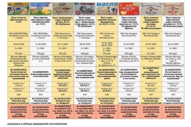 13 брендов сливочного масла в магазинах Петербурга оказались фальсификатом Проверка «Общественного контроля» показала, что в петербургских магазинах под видом сливочного масла продают 13 из 15 проверенных образцов. Вместо заявленного молочного жира производители используют растительные масла, выдавая дешёвый спред за натуральное масло. Лишь два вида масла оказались настоящими. А подробнее — в карточках. 📷: «Общественный контроль» Подпишись на Комсомольскую правду: СПб — отдай свой буст нам