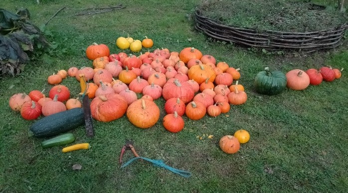Кажется, что много, но учитывая то, насколько бодро мы принялись их поедать - мало. Тыковки порционные, есть побольше, но есть и совсем маленькие, с кулачок, так что результат нужно делить на два - то есть, на две наши персоны, и это, грубо говоря, нам на пятьдесять раз поесть. Только нам, а ведь у нас ещё козы, собаки, котаны, куры какие-нибудь вдруг могут завестись, и все они тоже тыквы любят. Надо сажать ещё больше.