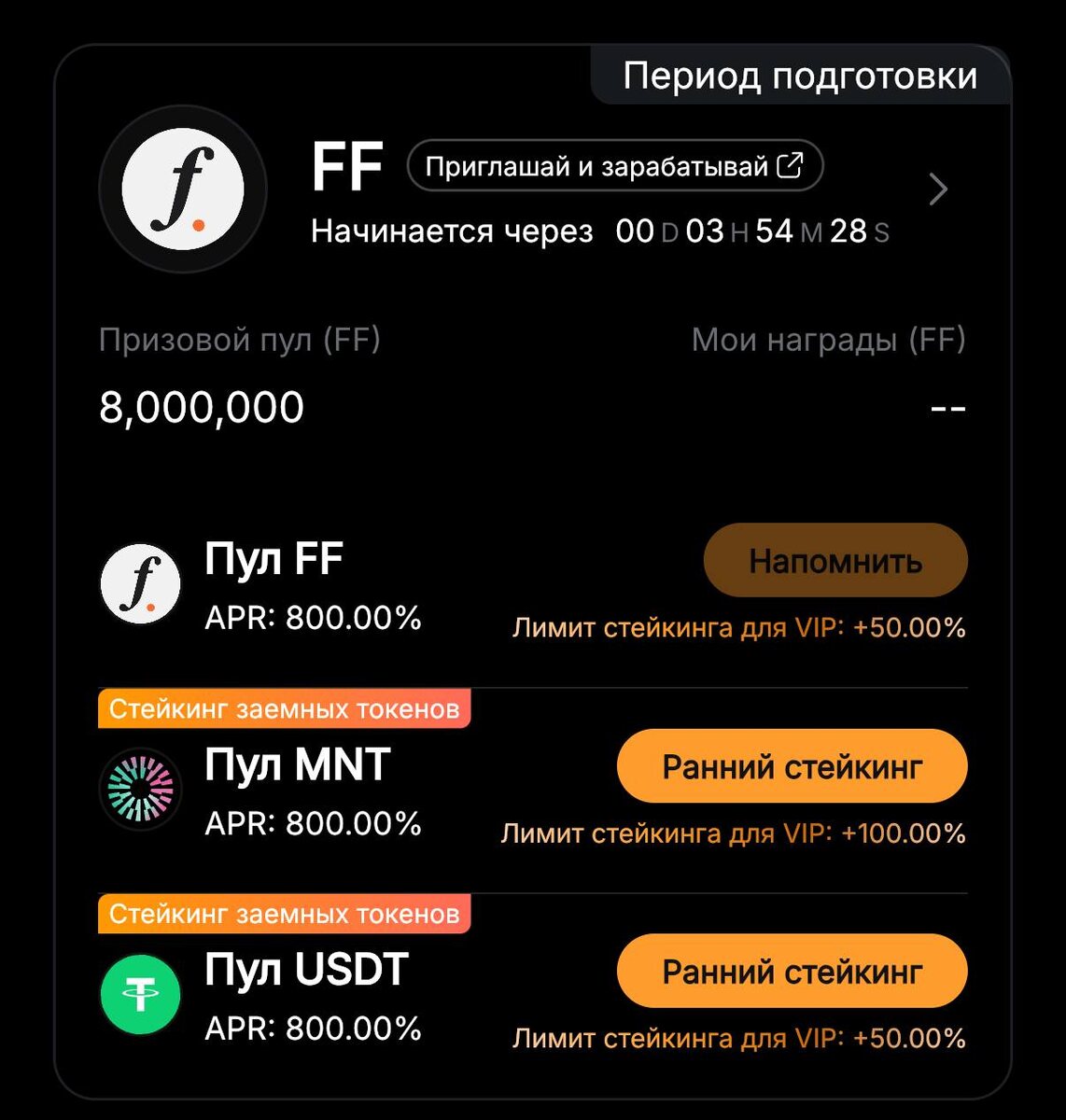 Через 3 часа на Bybit стартует пул монеты FF. Без ВИП статуса можно закинуть до 2000 USDT. Ничем не рискуем, лежат до 5 октября и вам капают монеты FF которые на байбите и продаем. 🚀 Пул тут - https://www.bybit.com/en/trade/spot/spotx 🚀 Байбит - https://partner.bybit.com/b/108652