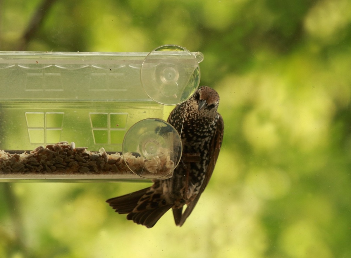 Сегодня на кормушку Веранда первый раз за 5 лет прилетел скворец. До этого они все время крутились рядом, на рябине и лишь наблюдали за синицами, которые ели с кормушек или ели подвешенные на ветки лакомства, а вот самый смелый сегодня для себя открыл новый способ добыть еду перед отлётом в теплые края.