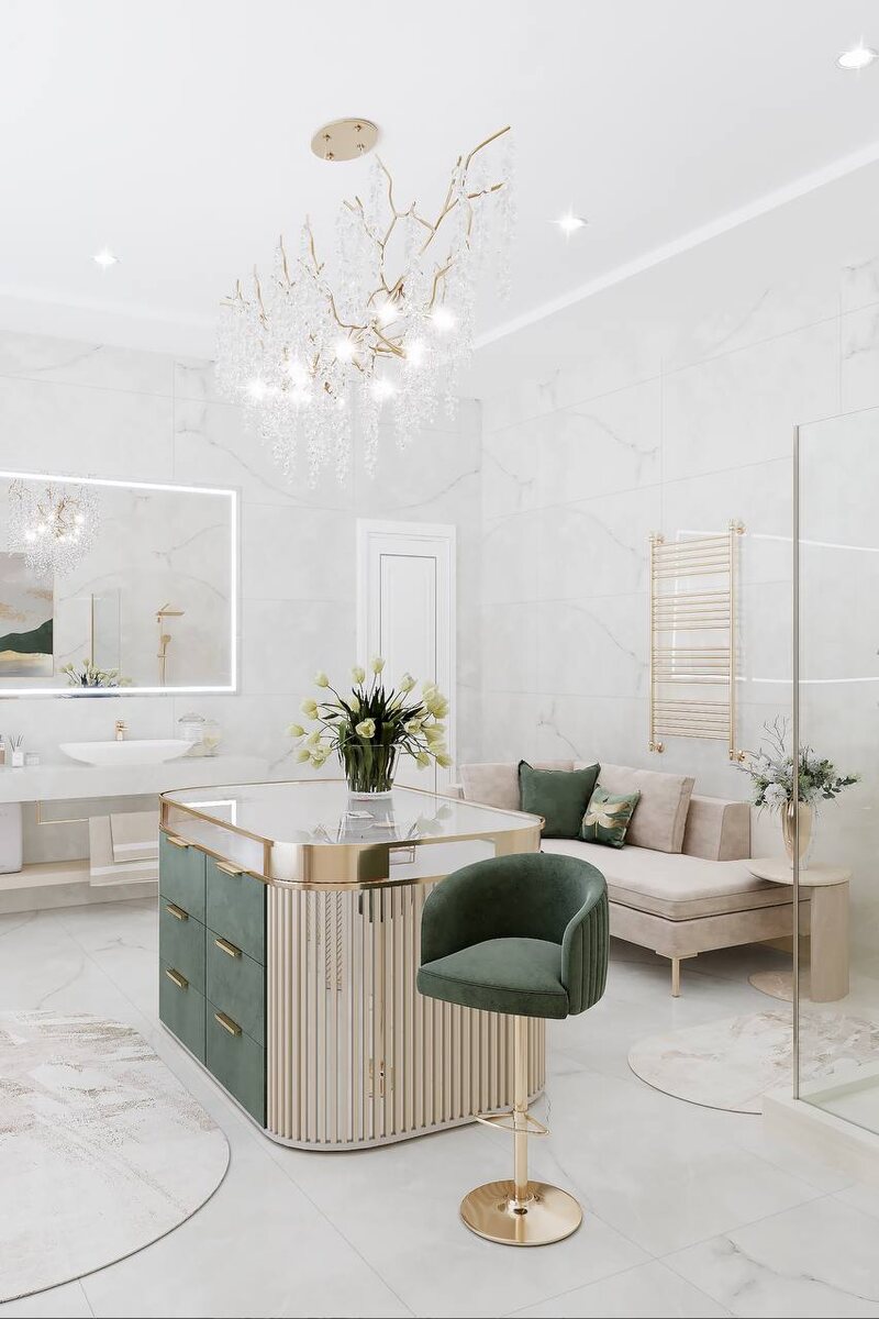 Представьте себе утро, которое начинается не с суеты, а с истинного наслаждения красотой и пространством. Этот дизайн-проект — о роскоши, эстетике и комфорте! Ванная комната, где каждая деталь подчеркивает вкус владельцев. Белоснежный мрамор с мягкими прожилками создаёт фон для изысканных акцентов — золота и глубокого изумрудного бархата. Центр композиции — остров с зелёными фасадами и сияющей столешницей, отражающей свет хрустальной люстры, словно капли росы на ветвях. Это пространство не только для ухода за собой, но и для перезагрузки. Хотите реализовать все свои мечты и желания в дизайн-проекте? Переходите по ссылке и оставляйте заявку, мы свяжемся с вами в ближайшее время ❤️