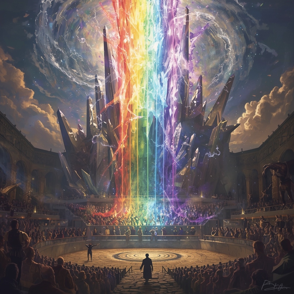 Семь потоков магии наконец соединились, образуя радужный столп света, который устремился к небу. Изначальный Источник вспыхнул с такой силой, что озарил весь мир.