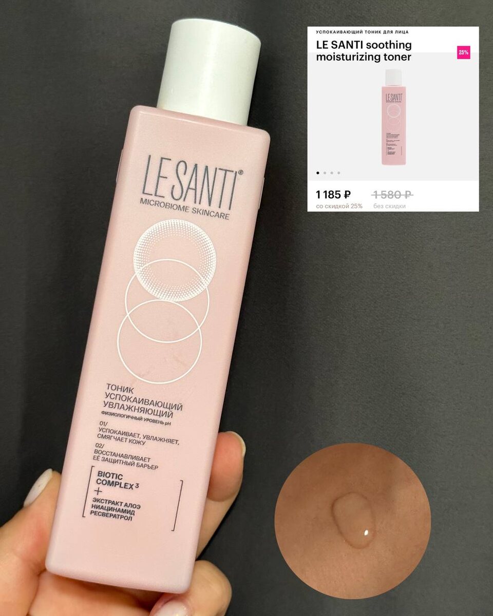 Нас вводят в заблуждение, на секционном столе тоник от Le Santi и мы начинаем диссекцию. При первом же применении у меня случился приятный шок. Это же не тоник, а тонер! А значит можем юзать и как сыворотку при жирной коже, это первый приятный плюс. Второе — это запах того самого чая со смородиной, без кошачьих ссак, только нежность и забота за маминым столом после тяжелого дня. Копаем вглубь: обещают увлажнение и «спокойствие» кожи = снижение чувствительности, покраснения: все имеем для этого — центелла, мадекасоссид, биотики, ниацинамид и алоэ, а бонусом — ресвератрол как антиоксидант. Еще из плюсов: не оставляет липкости, но нужно время чтобы впитаться (около 10 минут на мне), расход небольшой если наносить руками (не диском) — а я советую делать именно так чтобы не тратить зря продукт. Даю 10 из 10 смородиновых алмазов, с грустью буду завершать флакон. Еще больше интересного от врача-дерматолога, трихолога про здоровье, красоту, рабочие бьюти продукты, новости медицины мо