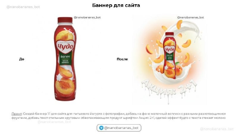 🎯 День 22/100: Nano Banana для бизнеса - фото товаров для маркетплейсов без фотостудии Продаете на Wildberries, Ozon или в своем интернет-магазине? Тогда знаете, что качественные фото товара - это половина успеха продаж Профессиональная съемка стоит от 3000₽ за товар, а если ассортимент большой, выходит в серьезные деньги. Плюс нужны разные ракурсы, фоны, сезонные обновления карточек.. Nano Banana решает бизнес-задачи с визуалом: - Продуктовая фотография: превращение домашних снимков в студийное качество - Lifestyle-сцены: показ товара в использовании без моделей и локаций - Удаление фона: чистые карточки для маркетплейсов по стандартам площадок - Замена цвета товара: демонстрация разных вариантов без пересъемки - Креативные баннеры: рекламные материалы для сайта и соцсетей Примеры хороших и рабочих промтов по визуалу: "Сделай макро-съёмку кольца с фото на черном фоне, отражения, акцент на деталях" "Интегрируй мою новую бутылку воды в эту спортивную сцену. Покажи, как девушка-спо