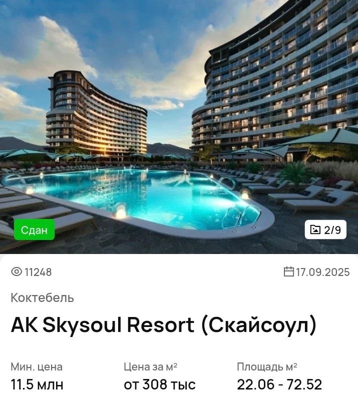 1. Скай Соул Резорт (Коктебель) На территории 15 гектаров земли строится огромный трехэтажный SPA площадью 4 тыс. кв. м. По размеру он как ресторан Дом, который находится в Сочи в морском порту. На этой территории будут подогреваемые бассейны с морской водой, разные медицинские услуги и многое другое.