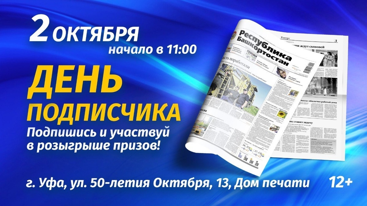 Уважаемые друзья, читатели газеты «Республика Башкортостан»! Приглашаем всех на День подписчика, который состоится 2 октября на площадке перед Домом печати.
