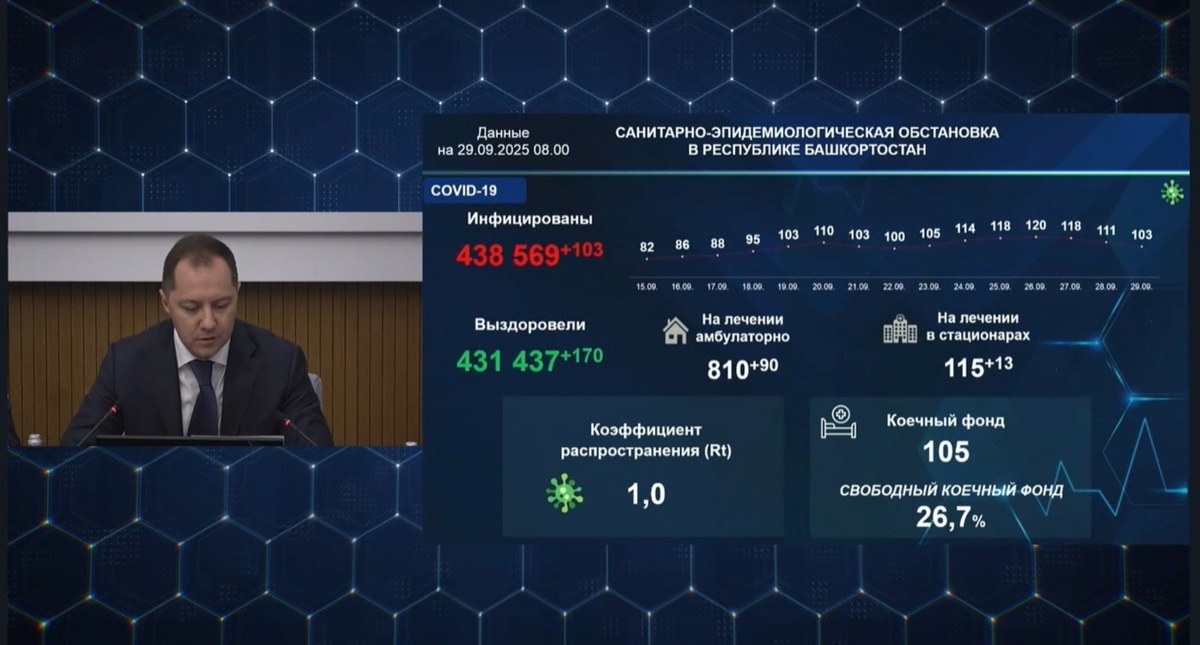 Впервые за последнее время сразу 103 человека заболели ковидом. Министр здравоохранения республики Айрат Рахматуллин сообщил на оперативном совещании правительства, что за минувшие сутки выявлено 103 случая заболевания коронавирусной инфекцией. В стационарах лечение от ковида проходят 115 пациентов. Амбулаторно лечатся 90 человек. Свободный коечный фонд составляет более 26 процентов, отметил Айрат Рахматуллин. Фото: скриншот видеотрансляции.