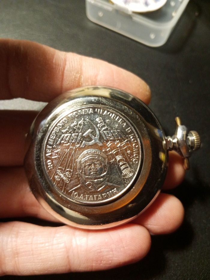 Глядя на сюжеты барельефов советских карманных часов невольно задаешься мыслью: А что это за странные и убогие сюжеты на их крышках? Вот все эти кораблики, паровозы, волки и глухари они что вообще должны были символизировать то? Глядя на все это безобразие у меня в голове возникла мысль создать карманные часы посвященные какой-то определенной теме или человеку. И поскольку из всех исторических персонажей советской эпохи мне наиболее симпатичны Сталин и Гагарин, я решил посвятить свою поделку именно Юрию Гагарину. Поиски в интернете различных вариантов вставок в крышку часов навёл меня на юбилейный рубль 1981 года, выпущенный по случаю празднования 20 годовщины первого полета человека в космос. Барельеф этой монеты мне прямо понравился, по своему размеру монета довольно хорошо вписывалась в крышку часов, так что мой выбор был очевиден и монета была заказана.