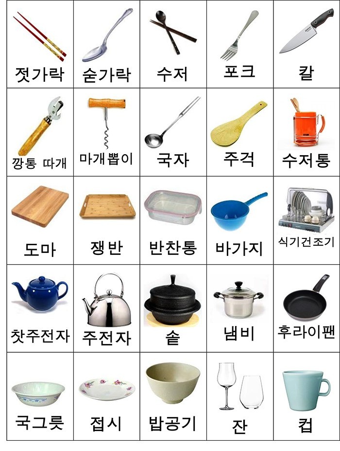 Сколько слов знаете? Забирайте карточки и изучайте 🌸 젓가락을 사용할 수 있어요? [чоткарагыль саёнъхаль су иссоё] Вы умеете пользоваться палочками? 젓가락[чоткарак] – палочки для еды 숟가락[суткарак] – ложка 수저[суджо] – палочки и ложка (кор. набор столовых приборов) 포크[пхокхы] – вилка 칼[кхаль] – нож 깡통 따개[кканътхонъ ттагэ] – консервный нож 마개뽑이[магэппоби] – штопор 국자[кукча] – половник 주걱[чугок] – поварешка, лопатка 수저통[суджотхонъ] – подставка для ложек и палочек 도마[тома] – разделочная доска 쟁반[чэнъбан] – разнос, поднос 반찬통[панчханътхон] – контейнер для еды 바가지[пагаджи] – ковш 식기건조기[щиккигончжоги] – сушильный шкаф 찻주전자[чхатчуджонги] – чайник (заварник) 주전자[чхуджонса] – чайник (для нагревания воды) 솥[сот] – котёл, большая кастрюля 냄비[нэмби] – кастрюля 후라이팬[хураипхэн] – сковорода 국그릇[куккырыт] – тарелка для супа (глубокая) 접시[чопщи] – тарелка плоская 밥공기[папконъги] – пиала для риса 잔[чан] – рюмка, стакан, бокал 컵[кхоп] – кружка У нас в школе очень много всего интересного: https://koreanclass.skillspace