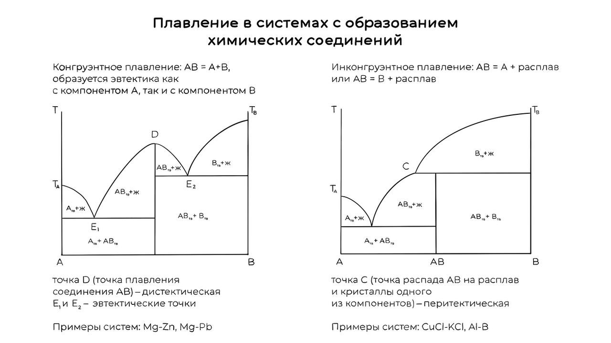 Примерами систем с образованием нескольких химических соединений, плавящихся конгруэнтно, являются системы Ag – Ca, Mg – Zn, Cu – Mg. Если состав образующейся кристаллической фазы не совпадает с составом расплава, то говорят, что соединение АВ плавится инконгруэнтно. Инконгруэнтно плавящиеся соединения образуются, например, в системах Au – Sb, CuCl – KCl, Al – B. #все_ответы_в_науке_МИФИ Материал подготовлен при поддержке гранта Минобрнауки России в рамках Десятилетия науки и технологий