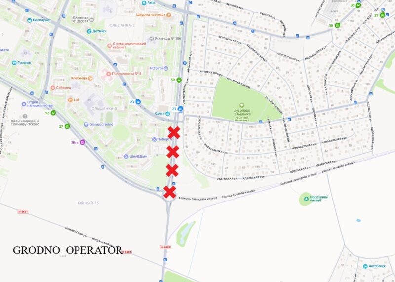 – маршрут №50 «Улица Ольшанская – Вишневец» курсирует: остановочный пункт «Улица Ольшанская» – остановочный пункт «Улица Наполеона Орды», далее: ул. Огинского – ул. Отечественная и далее по своему маршруту без изменений, обратно в том же направлении.