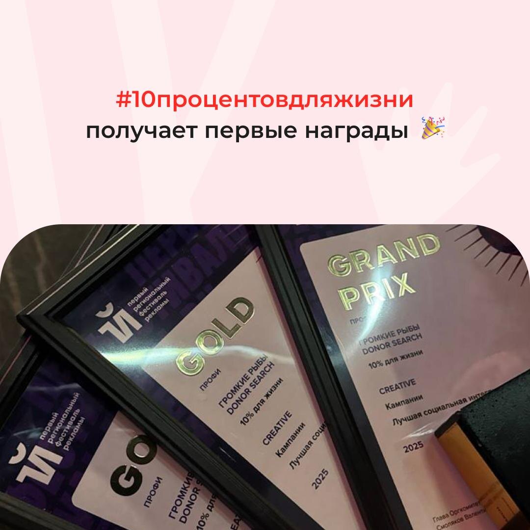 🏆 У нас хорошие новости! Проект #10процентовдляжизни, который всего несколько месяцев назад стартовал вместе с Cofix, ВкусВилл, T2, Ситидрайв, МТС Юрент и X5, уже успел собрать первые награды. 📌 На форуме НРФ Регионы в Екатеринбурге взяли сразу: — 2️⃣ гран-при — 3️⃣ золота — 1️⃣ серебро 📌 А чуть позже — победу в номинации «Общественно-значимые PR-кампании» на PROBA Awards 🎉 Проект создан DonorSearch и креативным агентством Громкие Рыбы при поддержке PR-агентства Rassvet.digital. Со сцены наши друзья рассказывали про донорство крови и про то, как идея «отдать 10%» превратилась в всероссийский челлендж. И это только начало! Спасибо всем, кто уже присоединился — брендам, медиа и людям, которые выделяют свои 10% ради помощи другим 🙌 А если вы ещё не с нами — самое время стать частью движения: 10процентовдляжизни.рф
