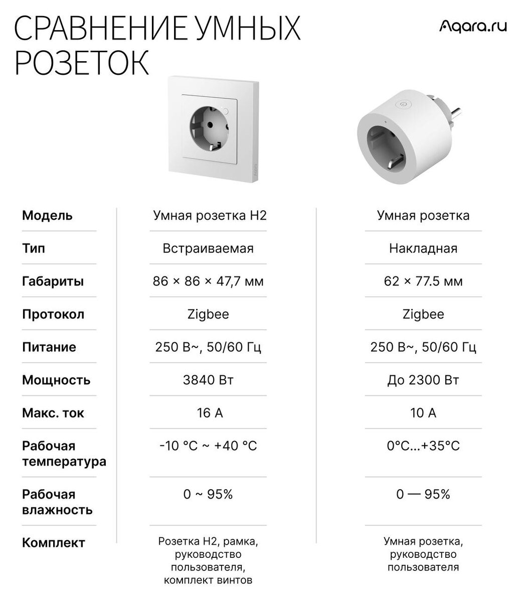 Сравнение умных розеток Aqara. Какая подойдет вам? Умные розетки Aqara превратят обычные устройства в вашем доме в умные. Управляйте торшерами, обогревателями, вентиляторами и другой бытовой техникой через приложение Aqara Home и настраивайте автоматизации. Примеры автоматизаций: 1 — Когда вы возвращаетесь домой, через приложение Aqara Home заранее включайте обогреватель, подключенный к умной розетке. 2 — Если: датчик движения зафиксирует, что вы зашли в гостинную. То: торшеры, подключенные к умной розетке, включатся автоматически. На данный момент на российском рынке представлены 2 модели умных розеток: 1 — Умная встраиваемая розетка H2. Настенная Zigbee-розетка, подходящая под рамки 55 мм, которая умеет предоставлять точные данные об энергопотреблении, что позволяет сокращать расходы электроэнергии. Устройство обладает памятью состояния питания. Это значит, что подключённые к розетке устройства останутся в том же состоянии после подачи электричества, в случае его неожид