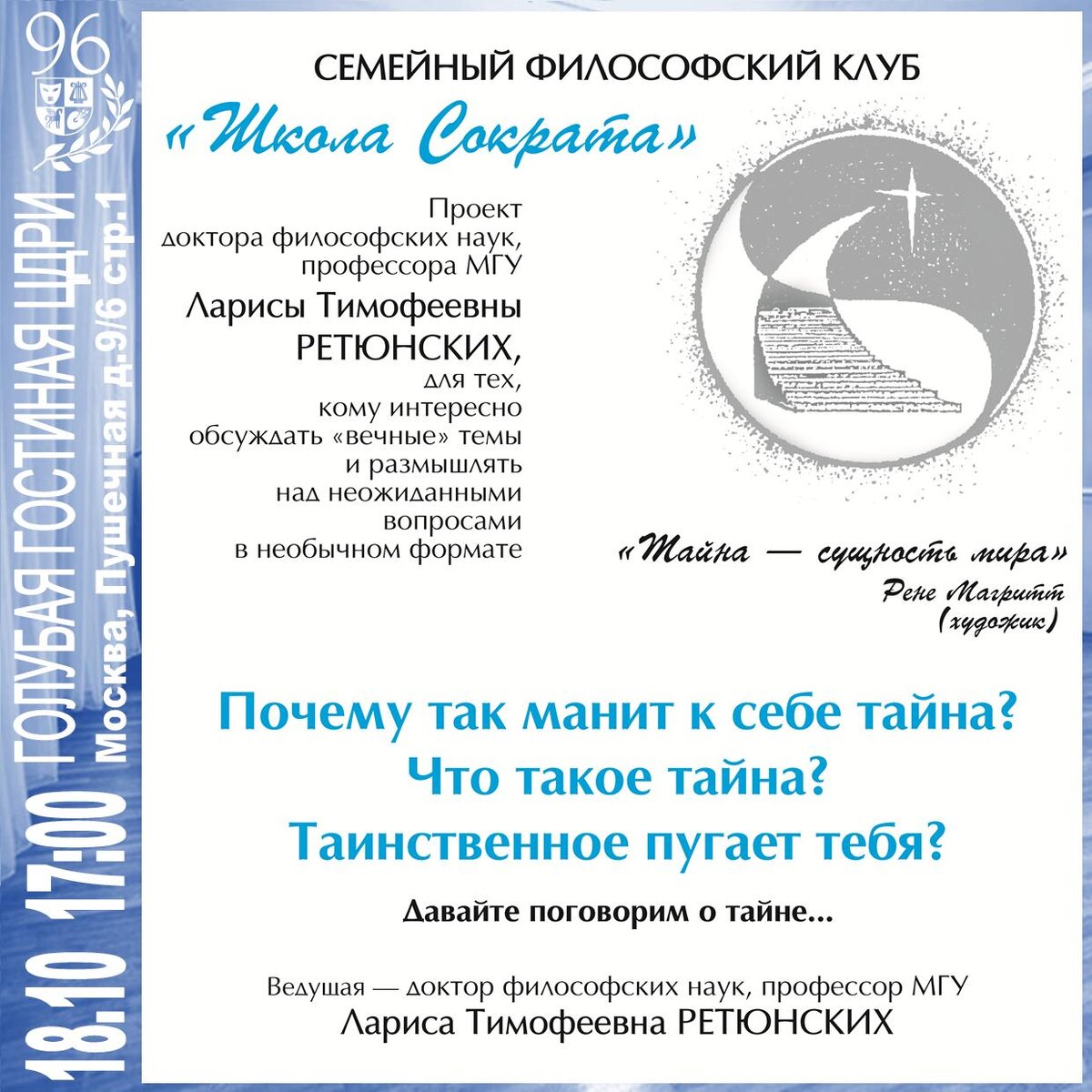 Таинственное пугает тебя? Давайте поговорим о тайне… Проект доктора философских наук, профессора МГУ — Ларисы Тимофеевны Ретюнских Для тех, кому интересно обсуждать «вечные» темы и размышлять над неожиданными вопросами в непривычном формате. Ведущая — Лариса Ретюнских Билеты на сайте: https://cdri.ru/afisha/oktyabr-2025/shkola-sokrata-_-18-oktyabrya.html