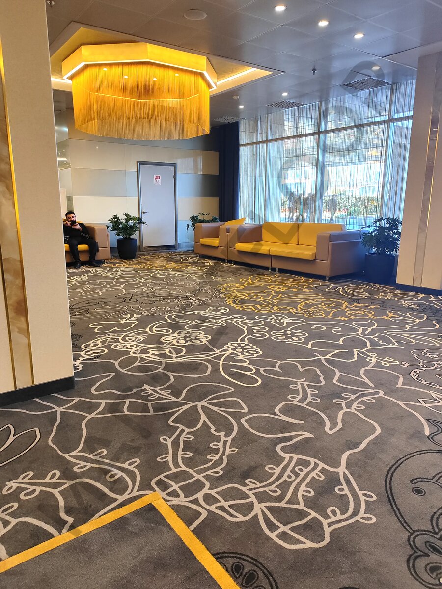 Оригинальный ковролин для холла коммерческого назначения. Проектирование и настил под ключ в Москве начинался с подготовки основания. Дизайн-проект был заранее согласован и ниже результат. Холл зонирован и каждая локация создавалась отдельно, но в единой концепции. Мастера использовали технология спаивания нескольких полотен ковролина для достижения оригинального дизайна и зонирования. Важным этапом было подготовить основание и сделать стяжку пола После высыхания бетонной стяжки была произведена укладка специальной подложки, что обеспечит долговечность эксплуатации. Там где стяжка не нужна и основание было ровное - можно сразу приступить к настилу. Приклеивание осуществлялось только профессионалами специальным клеем, подобранным для конкретной поверхности. Важным моментом для достижения лучшего результата и эффекта был изготовлен плинтус из ковролина с оверлоком края - эксклюзив от профессионалов. Обращайтесь только к профессионалам!
