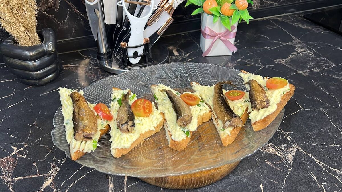 Привет-привет! Хочешь устроить шикарный фуршет или поразить гостей оригинальной и элегантной закуской? Попробуем приготовить самые аппетитные бутерброды со шпротами. Такие деликатесы украшают праздничные столы и поднимают настроение каждому гостю! Что понадобится: - Белый хлеб (желательно квадратной формы) — 6–8 ломтиков - Баночка качественных шпрот — 150 г - Молодой зеленый лук — маленький пучок - Творожный кремообразный сыр — 150 г - Картофель — 2 больших клубня - Яйца — 2 шт. - Помидоры Черри — 6 штук Как приготовить: 1. Сначала отварим картофель и яйца до готовности. Охладим их и очистим. 2. Ломтики белого хлеба разрезаем на аккуратные треугольнички и подсушиваем их на сухой горячей сковороде до хрустящей корочки с двух сторон. 3. Картошку и яйца пропускаем через мясорубку или измельчаем блендером, добавив творог и пропущенный сквозь пресс зеленый лук. У нас получилась нежная, мягкая паста. 4. Этой массой равномерно покрываем ломтики хлеба. Удобнее всего делать это маленькой лож
