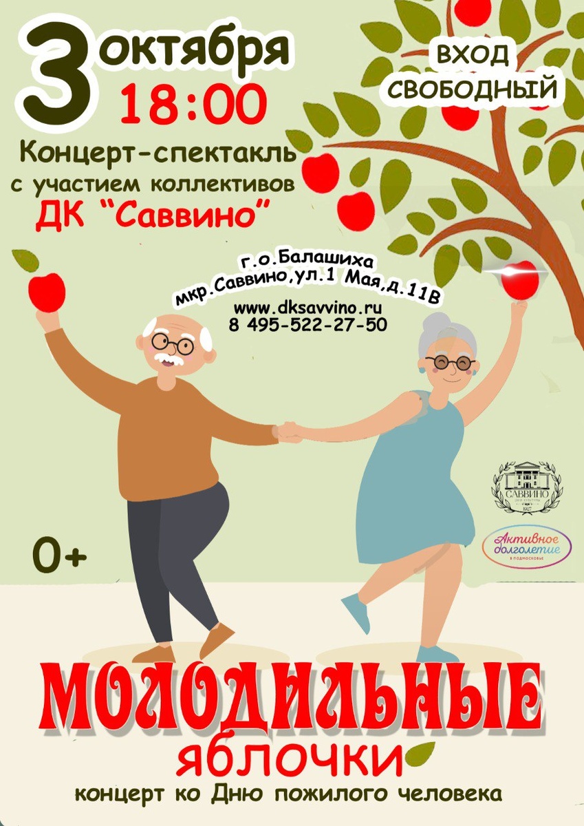 Дорогие друзья! 🎤Приглашаем вас на концерт-спектакль «Молодильные яблочки» с участием творческих коллективов ДК «Саввино»! Мероприятие посвящено Дню пожилого человека и пройдёт в тёплой и дружеской атмосфере. 📌Дата и время: 3 октября в 18:00 Место проведения: ДК «Саввино» Вход свободный! Не упустите возможность насладиться талантливым исполнением и провести вечер в компании замечательных людей. Ждём вас!