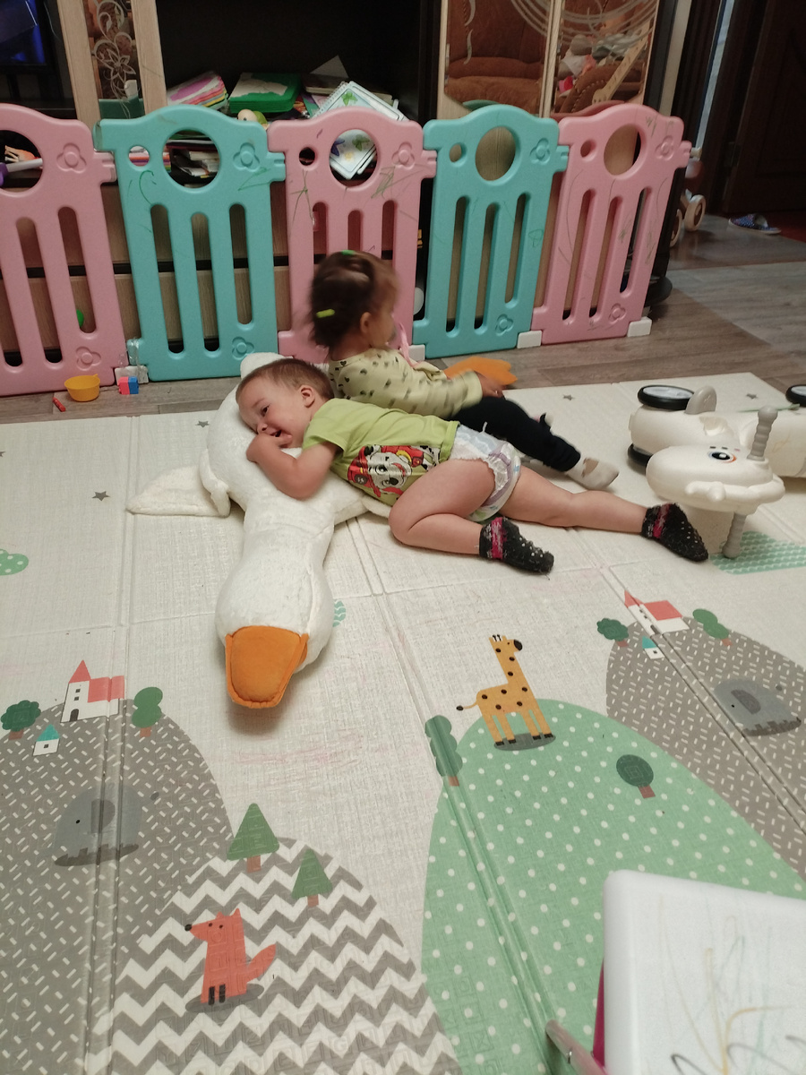 Еще вот раздумываю, собрать бассейн и доставать его иногда попрыгать или вообще убрать, уж очень много места занимает, и накладно постоянно от него шарики собирать. Но думаю, что поставлю. Любят в нем поваляться малыши.