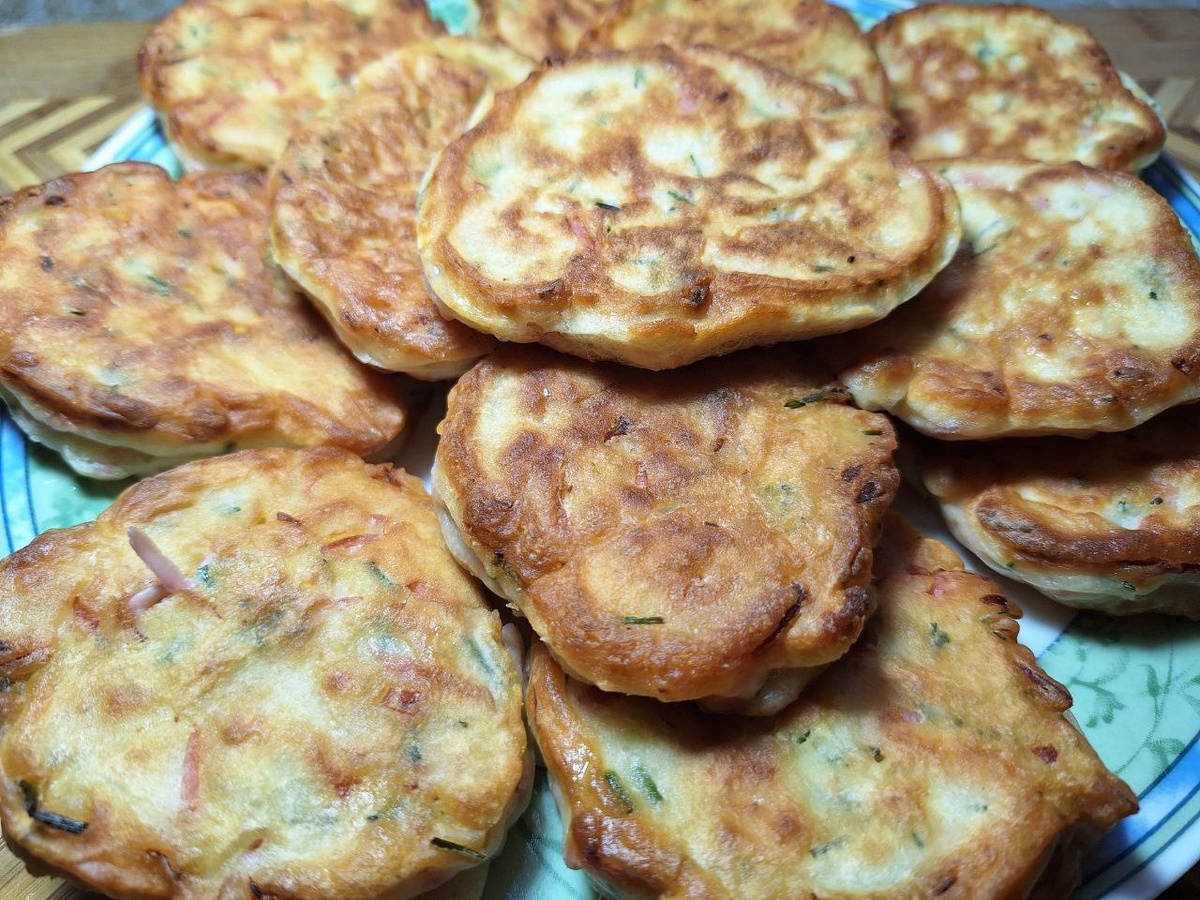 Колбасу натереть на крупной терке, зеленый лук нарезать, добавить яйцо,кефир,разрыхлитель,соль и постепенно ввести муку.Жарим на раст.масле, как обычные оладушки.