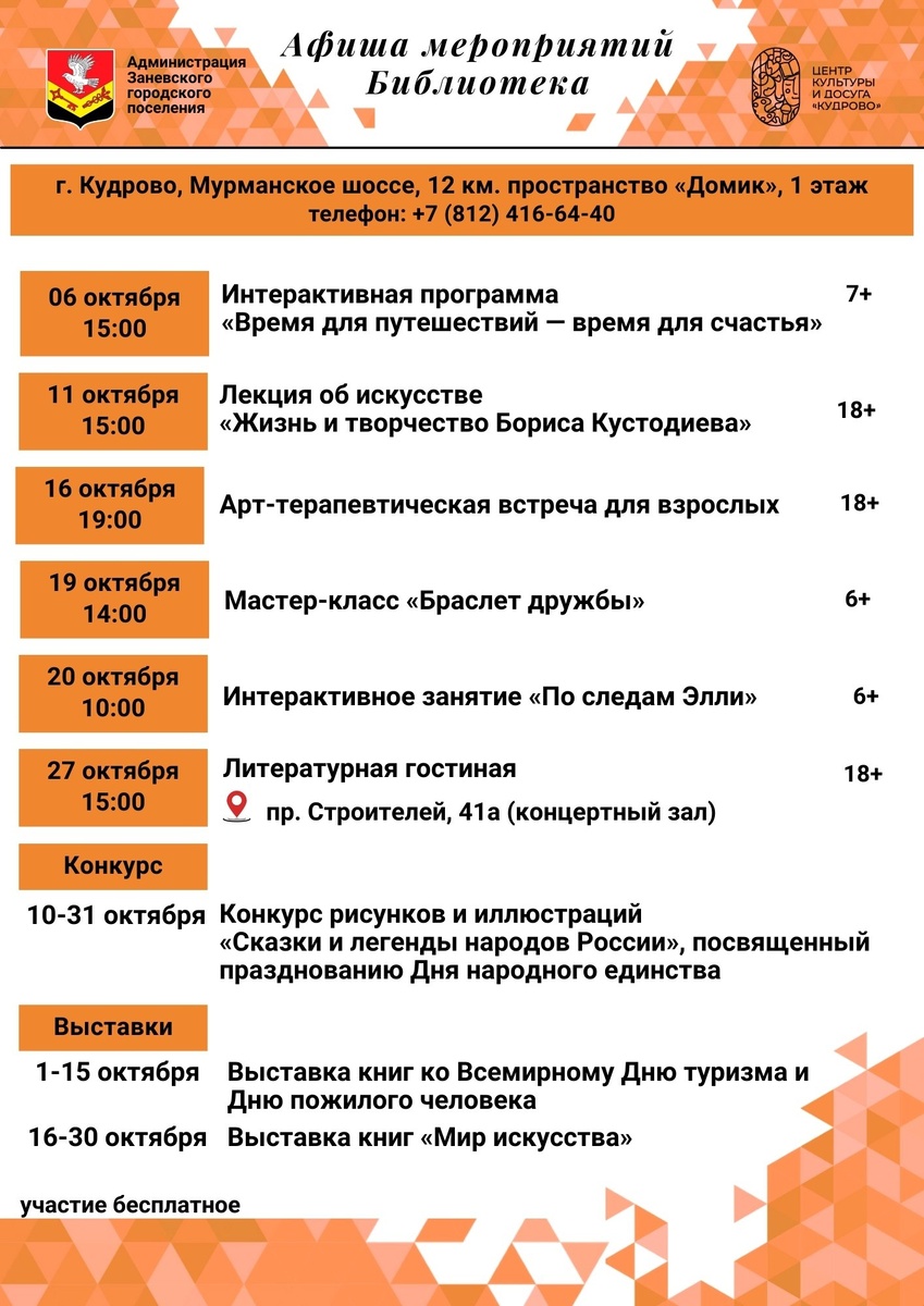 Афиша октябрьских событий в муниципальных домах культуры города Кудрово Регистрация для занятий в общественном пространстве «Домик» проходит в сообщениях группы кудровского ДК. ДТП и ЧП Кудрово
