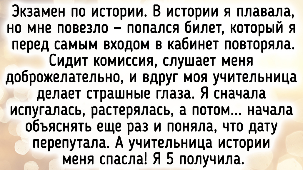 Экзамен по истории. В истории я плавала, но мне повезло — попался билет, который я перед самым входом в кабинет повторяла. Сидит комиссия, слушает меня доброжелательно, и вдруг моя учительница делает страшные глаза. Я сначала испугалась, растерялась, а потом... начала объяснять еще раз и поняла, что дату перепутала. А учительница истории меня спасла! Я 5 получила.