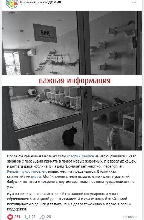 Сотрудникам даже пришлось приостановить ремонт. Так что создания новых мест пока нет даже в отложенных планах. Ранее в «Кошачьем домике» сообщали, что приостановили ремонт новой комнаты, так как не справляются финансово. Последнее что смогли оплатить волонтеры — электропроводку: