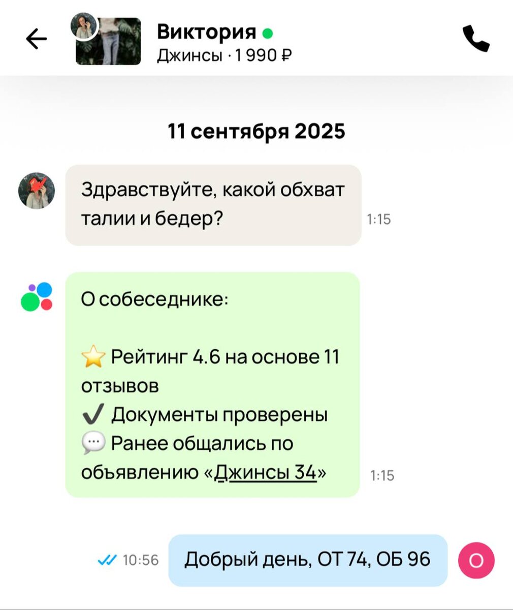 со мной такое впервые, без преувеличения, при наличии замеров в дюймах и сантиметрах, фото всевозможных ракурсов и возможности примерить джинсы/хотя бы приложить к своей талии или чему ещё в пункте выдачи она их забирает и молчит сутки. возможно, она уже просто надев их, решила потом вернуть, как они привыкли делать это на ВБ (но все это лишь мои домыслы), тем не менее в ее собщении нет ни вопроса, ни требования и я ее игнорирую без злого умысла, но от отсутствия малейшего понимания, как с ней разговаривать и что-то ей объяснить.