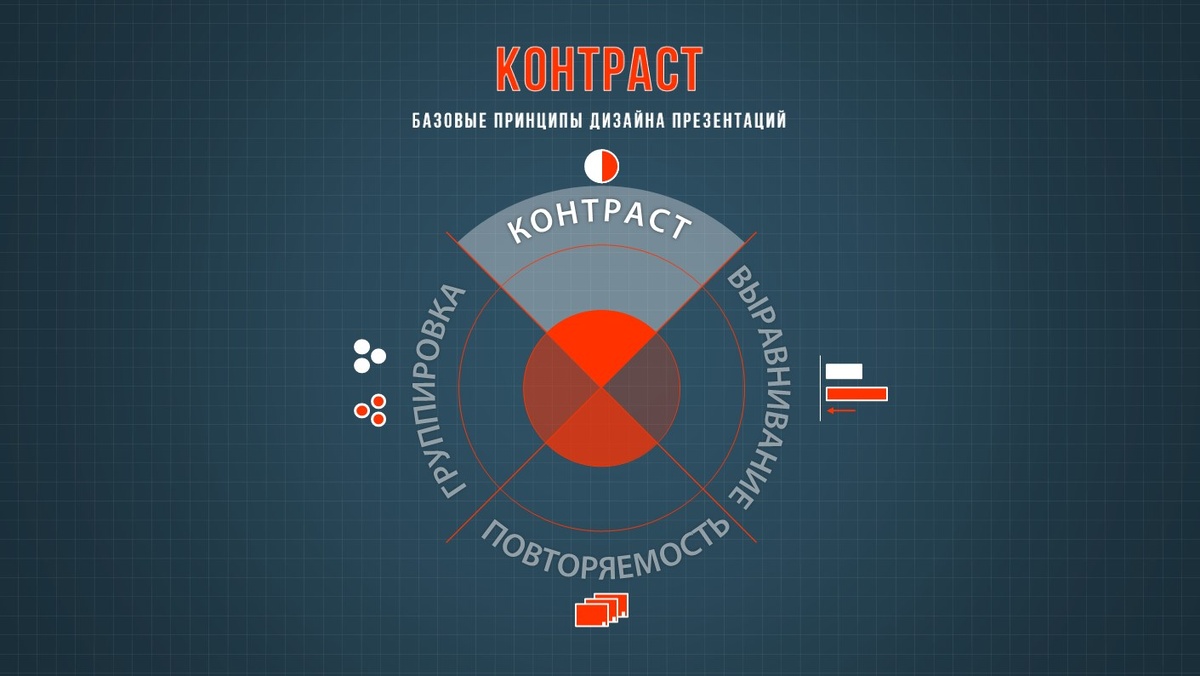 Дизайн презентации – это работа по управлению вниманием аудитории: что выделить, на чём заострить взгляд, а что оставить фоном. Для этого, среди прочего, применяется принцип контраста — приём, позволяющий подчеркивать главное и расставлять акценты. Правильное использование контраста делает структуру слайда ясной и помогает зрителю быстро уловить его смысл. Контраст возникает там, где есть заметное различие. Если все элементы равнозначны, взгляд «расплывается» по поверхности слайда. Но стоит одному элементу выделиться — и он сразу становится центром восприятия. Контраст создает видимые различия между элементами, подчеркивая их относительную важность. Когда все объекты выглядят одинаково (например, имеют единый размер шрифта), они воспринимаются как равнозначные. Изменение визуальных параметров для ключевых элементов контента слайда сразу указывает зрителю на иерархию: что является главным, а что — второстепенным. Это делает контраст эффективным механизмом управления фокусом внимания зри