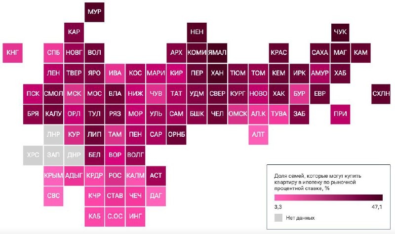 Марий Эл заняла 56 место в рейтинге регионов России по доступности ипотеки. В регионе доля семей, которые смогут себе позволить ипотеку по рыночной процентной ставке, насчитывает 13,7%. В среднем размер ежемесячного платежа в республике составляет 67,5 тысяч рублей. Для сравнения, Татарстан находится на 49 месте (14,7%), Чувашия на 66-м (11,2%), Кировская область на 59-м (13,4%) и Нижегородская область на 57-м (13,6%). На первом месте Ямало-Ненецкий АО (47,1%), на втором Ханты-Мансийский АО – Югра (44,3%) и на третьем месте Чукотский АО (42%), пишет РИА Новости. 📸 Скрин: РИА Новости