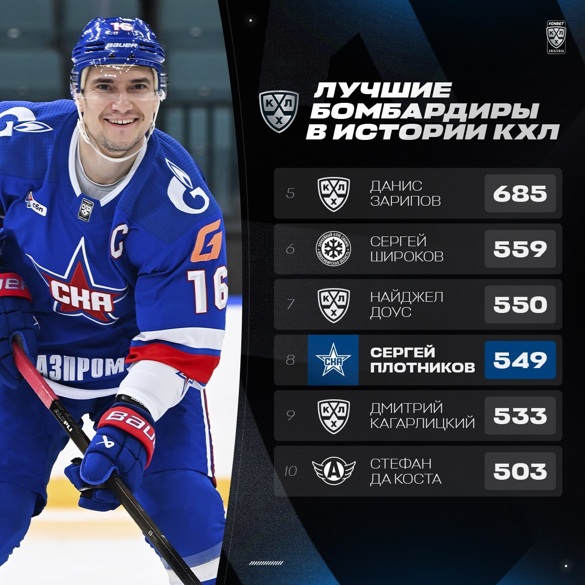 Сергей Плотников находится в шаге от 7-й строчки рейтинга бомбардиров в истории КХЛ